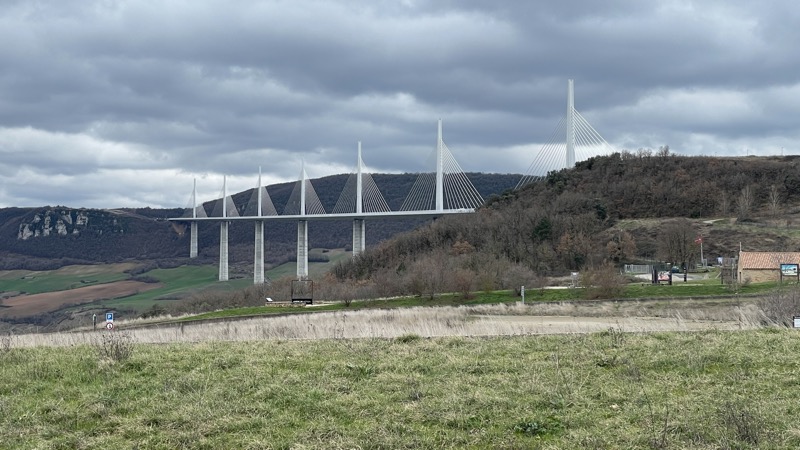 Dann ging es weiter in Richtung Süden. Die Route führte uns an Clermond-Ferrand vorbei über das Zentral-Massiv zur Brücke von Millau. Das knapp 2,5 km lange Bauwerk gilt als die größte Schrägseilhängebrücke Europas. Die Fahrbahn überspannt das Tal in 270 Metern Höhe. Schon von weitem sind die rund 350 m hohen Brückenpfeiler zu sehen. Als wir die Ausfahrt Mende passieren, werden Erinnerungen an die letztjährige Tour de France mit der Bergankunft in Mende wach.
